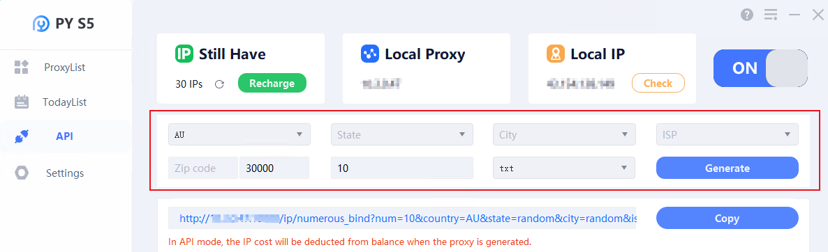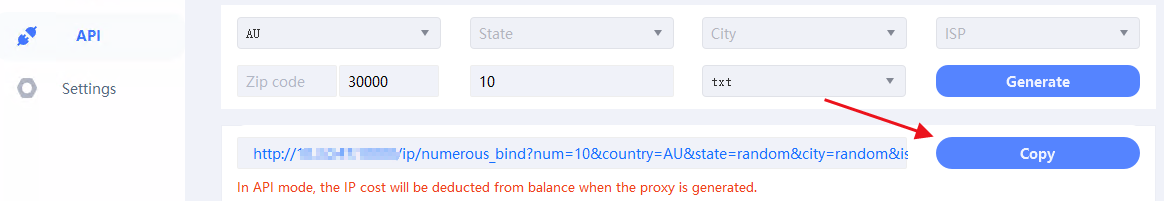 Choose or input parameters in the boxes, including region, ISP, Zip code, Start Port, the amount of IPs you want to generate. Click Generate to create your API link.