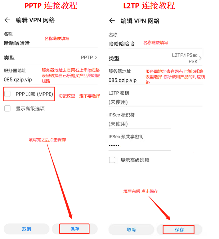 4、类型选择 PPTP或者L2TP/IPSec PSK,切记选择