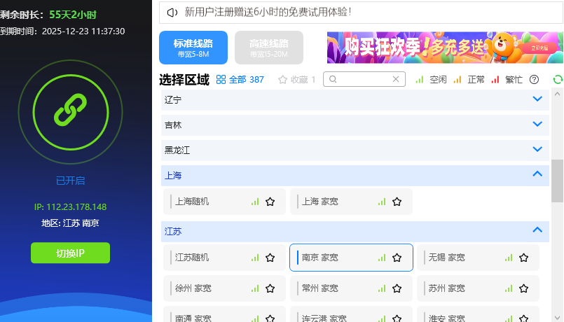 这类工具原本主要是用于游戏加速或网络优化,但因为它会分配不同的国内节点,所以也能实现IP属地的变更。操作流程很简单:下载软件后注册账号,选择国内某个城市的节点并连接,之后重新打开抖音发布内容,属地一般就会显示为节点所在地区。