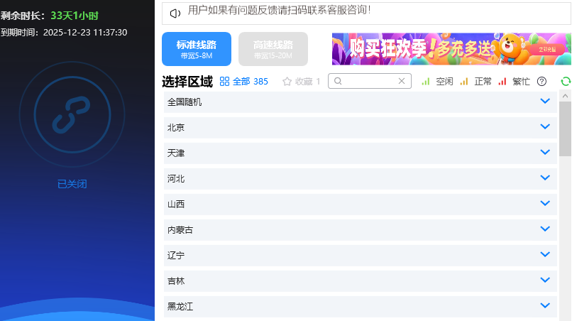 3. 选择节点:打开软件后,你可以直接看到全国多个城市的线路。比如你想换到“广东”,就选个广东的节点;