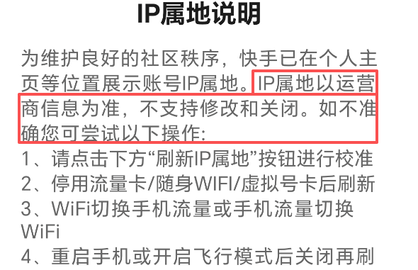 当然快手app官方也特别强调了,不是说开放这个刷新ip地址入口就代表可以直接通过这个入口去进行设置从而做到完全人为的的修改,快手官方原文中有一句:为维护良好的社区秩序,快手已在个人主页等位置展示账号IP属地。IP属地以运营商信息为准,不支持修改和关闭。