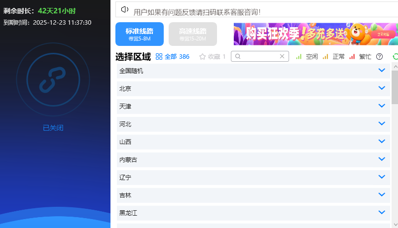 上面这些方法各有利弊,要么不够稳定,要么操作复杂。那么有没有更简便可靠的方法呢?这里还有一个邪修办法,直接找一款IP加速器,我这里用的是酷熊加速器。这类工具一般提供国内多个地区的节点选择,一键切换比较方便。