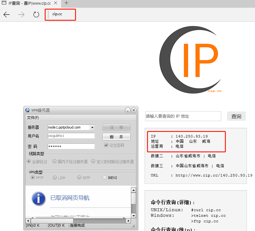 4:查看变化后的IP查看变化后的IP:浏览器输入 cip.cc 查看